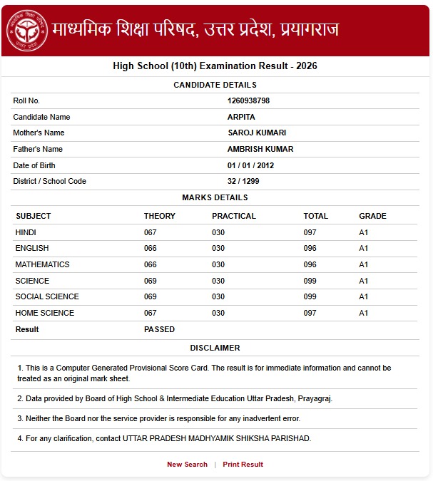 हाईस्कूल में तीसरी रैंक पाने वाली अर्पिता के विज्ञान और सोशल साइंस में 99 नंबर, देखिए मार्कशीट