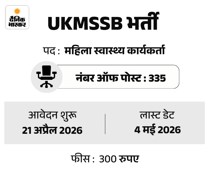 उत्तराखंड चिकित्सा सेवा चयन बोर्ड (UKMSSB) ने एएनएम भर्ती 2026 का नोटिफिकेशन जारी कर दिया है। ग्रुप सी के अंतर्गत स्वास्थ्य कार्यकर्ता (महिला) के 335 पदों पर भर्ती निकाली है। उम्मीदवार ऑफिशियल वेबसाइट ukmssb.org पर जाकर आवेदन कर सकते हैं।