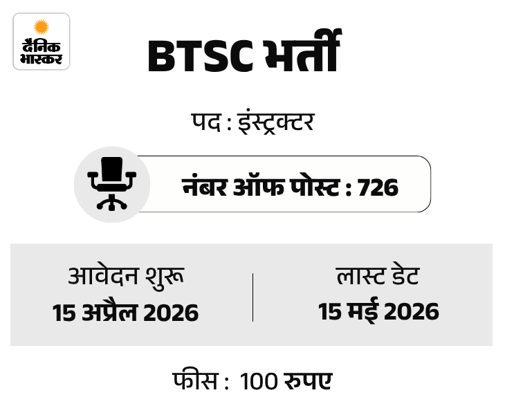 बिहार टेक्निकल सर्विस कमीशन ने 726 पदों पर भर्ती निकाली है। उम्मीदवार ऑफिशियल वेबसाइट btsc.bihar.gov.in पर जाकर आवेदन कर सकते हैं।