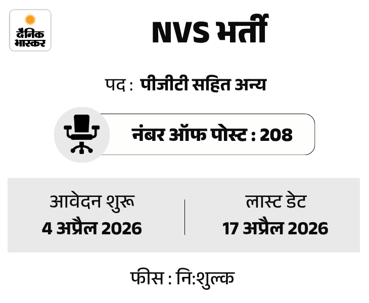 नवोदय विद्यालय समिति (NVS) ने पीजीटी, टीजीटी और स्पेशल एजुकेटर, स्टाफ नर्स के 208 पदों पर भर्ती निकाली है। इस भर्ती के लिए आवेदन की आखिरी तारीख 17 अप्रैल तय की गई है। उम्मीदवार ऑफिशियल वेबसाइट navodaya.gov.in पर जाकर आवेदन कर सकते हैं। यह भर्ती कॉन्ट्रैक्ट बेसिस पर की जाएगी।