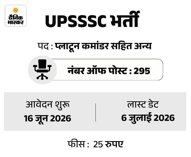 उत्तर प्रदेश अधीनस्थ सेवा चयन आयोग ने गृह सुरक्षा मुख्यालय के अंतर्गत प्लाटून कमांडर और ब्लॉक ऑर्गनाइजर के पदों पर भर्ती का नोटिफिकेशन जारी किया है। इस भर्ती के लिए 16 जून से आवेदन शुरू होंगे। उम्मीदवार ऑफिशियल वेबसाइट www.upcisb.upsdc.gov.in पर जाकर अप्लाई कर सकेंगे।