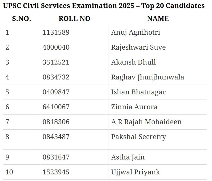 UPSC ने सिविल सर्विस एग्जाम 2025 का फाइनल रिजल्ट जारी कर दिया है। राजस्थान के कोटा के अनुज अग्निहोत्री ऑल इंडिया टॉपर बने हैं। कुल 958 कैंडिडेट्स अलग-अलग सर्विसेज के लिए क्वालिफाई हुए हैं। पूरा रिजल्ट ऑफिशियल वेबसाइट upsc.gov.in पर उपलब्ध है।