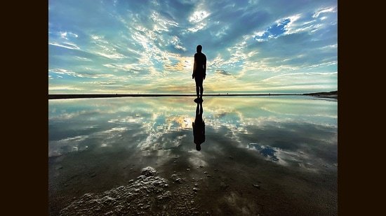 One of British artist Antony Gormley’s life-sized sculptures on Crosby Beach, England. What is the passage of time but a mirror image of what we’re doing with it? (Wikimedia)